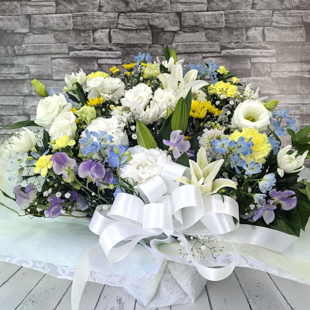 #1015 お供えアレンジメント 白、淡色を基本にしたアレンジメント 供え札・カード無料 14,000円 サイズ(高さ×幅×奥行)50×45×35cm カタログに掲載しているお花は、季節や入荷状況により全く同じ花材をご用意できない場合がございます。その際は、できるだけ雰囲気を損なわないよう、似たお花で代わりをご提案させていただきます。あらかじめご了承ください。 カタログ表記の価格には送料等の別途請求金額は含まれておりません。ご希望の商品の画像をご指定または商品番号をお伝え下さい。 10,000円~, アレンジメント, お供え
