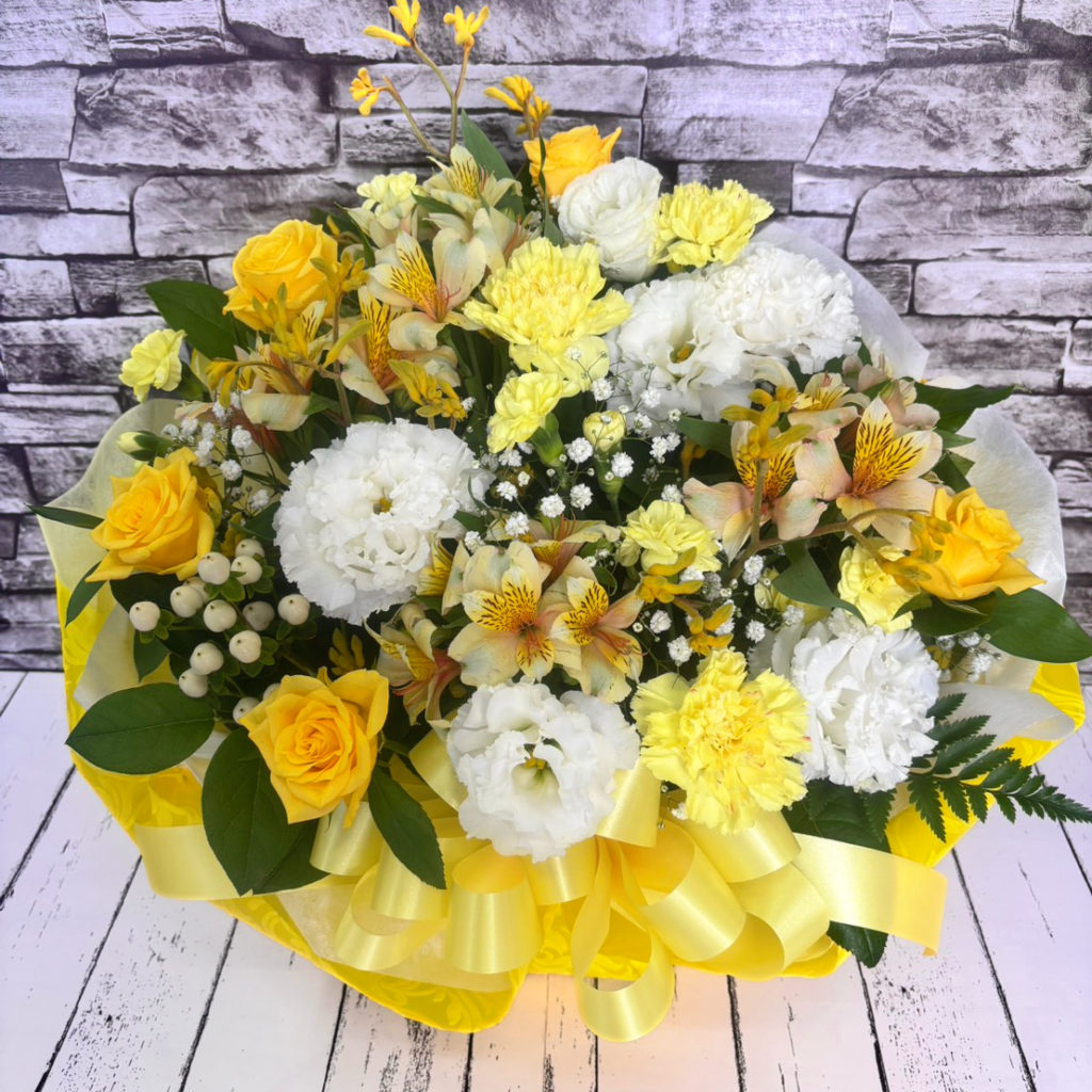 #113 アレンジメント イエロー・オレンジ系 通年商品 9,100円 サイズ(高さ×幅×奥行) 34×28×25cmカタログに掲載しているお花は、季節や入荷状況により全く同じ花材をご用意できない場合がございます。その際は、できるだけ雰囲気を損なわないよう、似たお花で代わりをご提案させていただきます。あらかじめご了承ください。カタログ表記の価格には送料等の別途請求金額は含まれておりません。ご希望の商品の画像をご指定または商品番号をお伝え下さい。