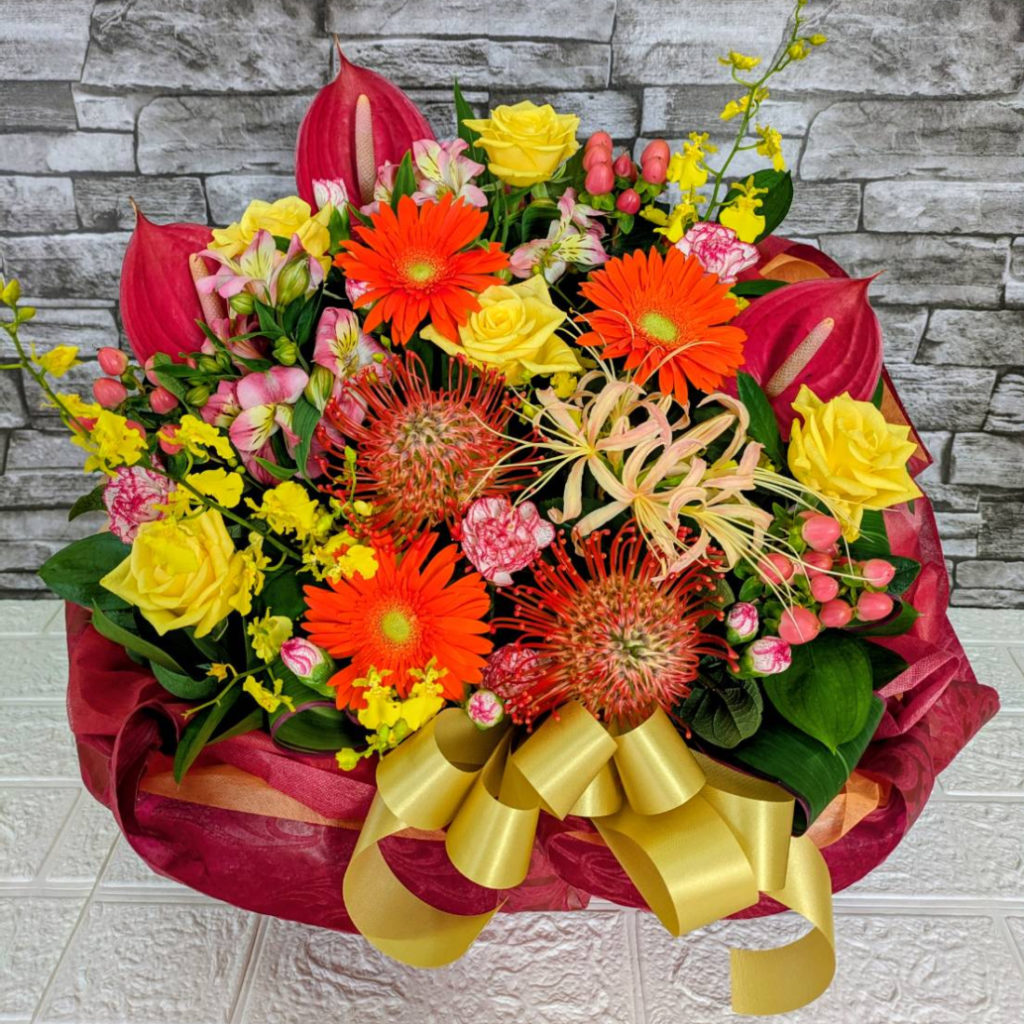 #257 アレンジメント ミックス系 通年可 9,700円 サイズ(高さ×幅×奥行) 38×30×30cmカタログに掲載しているお花は、季節や入荷状況により全く同じ花材をご用意できない場合がございます。その際は、できるだけ雰囲気を損なわないよう、似たお花で代わりをご提案させていただきます。あらかじめご了承ください。カタログ表記の価格には送料等の別途請求金額は含まれておりません。ご希望の商品の画像をご指定または商品番号をお伝え下さい。 アレンジメント, カラフルミックス系