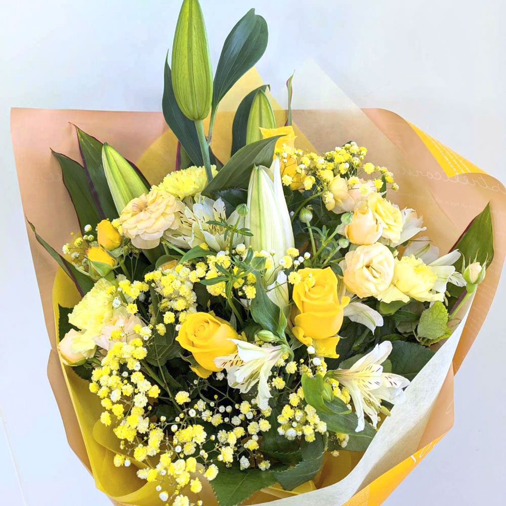 #652 花束 イエロー・オレンジ系 全国発送可 6,700円 サイズ(高さ×幅) 70×35cm カタログに掲載しているお花は、季節や入荷状況により全く同じ花材をご用意できない場合がございます。その際は、できるだけ雰囲気を損なわないよう、似たお花で代わりをご提案させていただきます。あらかじめご了承ください。 カタログ表記の価格には送料等の別途請求金額は含まれておりません。 ご希望の商品の画像をご指定または商品番号をお伝え下さい。